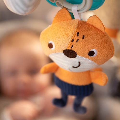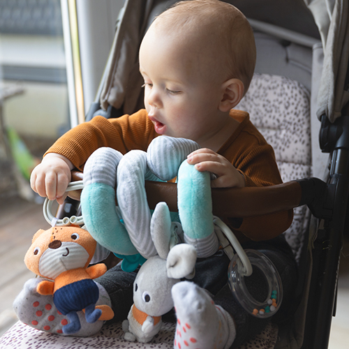 Совршена за количка, оваа спирална играчка гарантира забава дома и при прошетки, истовремено поттикнувајќи го когнитивниот и сензорниот развој на бебето.