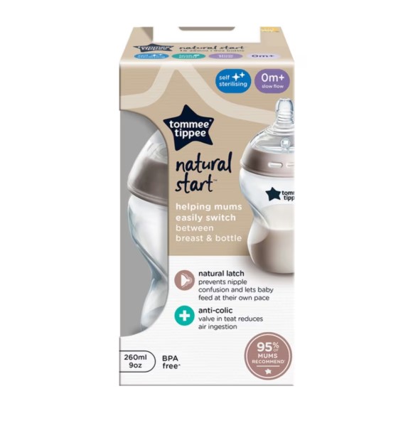 Tommee Tippee Самостерилизирачко Шише 260 мл Aнтиколик Natural Start(1 шише во пакување со цуцла 0+ м)