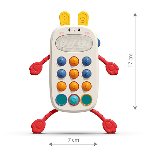 Изработена од безбеден силикон и издржлива пластика, RABBIT нуди различни начини на игра – може да се стиска, влече, притиска и преместува, поттикнувајќи ја љубопитноста и активното истражување.