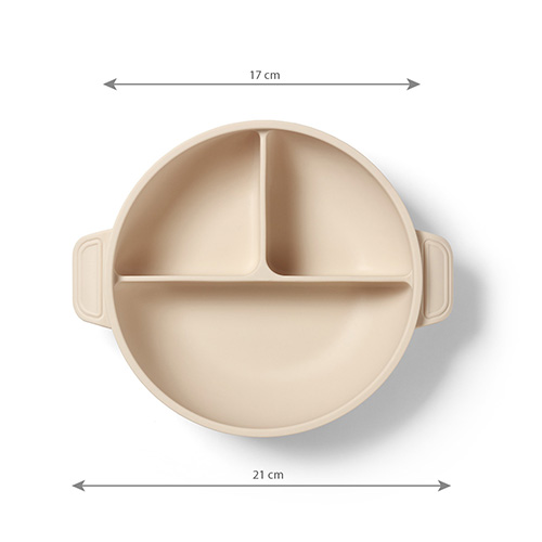Силната вакуумска основа ја држи чинијата цврсто на место, а заоблената форма овозможува полесно собирање на храната. Трите прегради овозможуваат одделно сервирање на различни намирници, со што детето може да го открива секој вкус посебно.